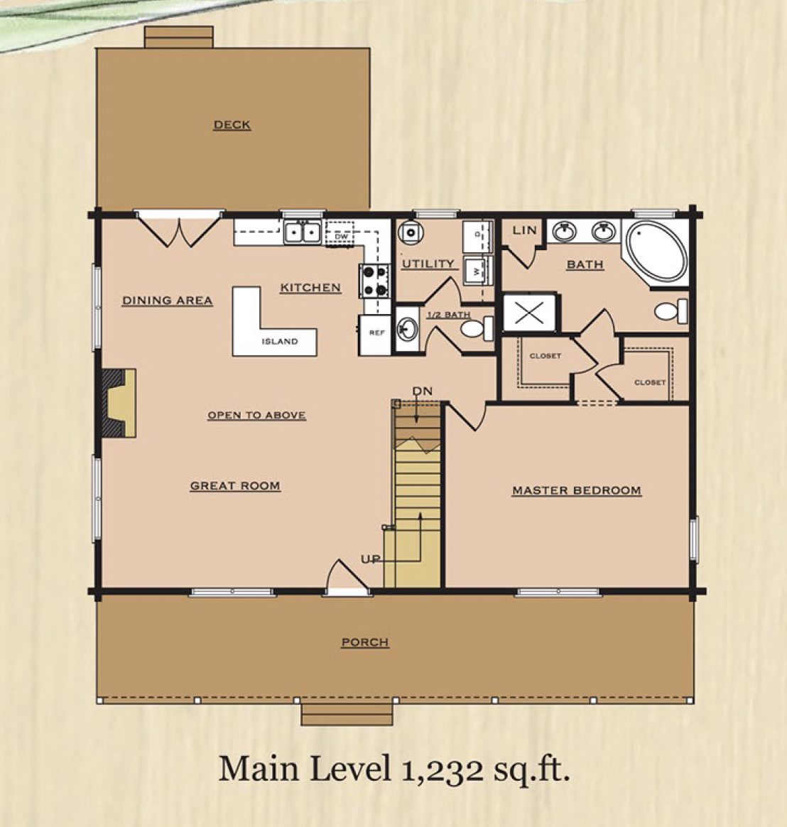The Fawn Trail is a two-story log home with 1,802 total square feet, including 1,232 square feet on the main level and 570 square feet on the second floor. The layout is designed for practical family living, with defined shared spaces downstairs and private bedrooms upstairs.