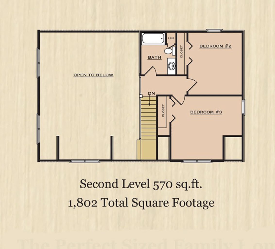 The second level includes two additional bedrooms and a shared bath, along with open space at the stair landing that can function as a small sitting area or flexible use zone. This separation between levels makes the Fawn Trail well suited for families, guests, or anyone who wants private sleeping areas away from the main living space.