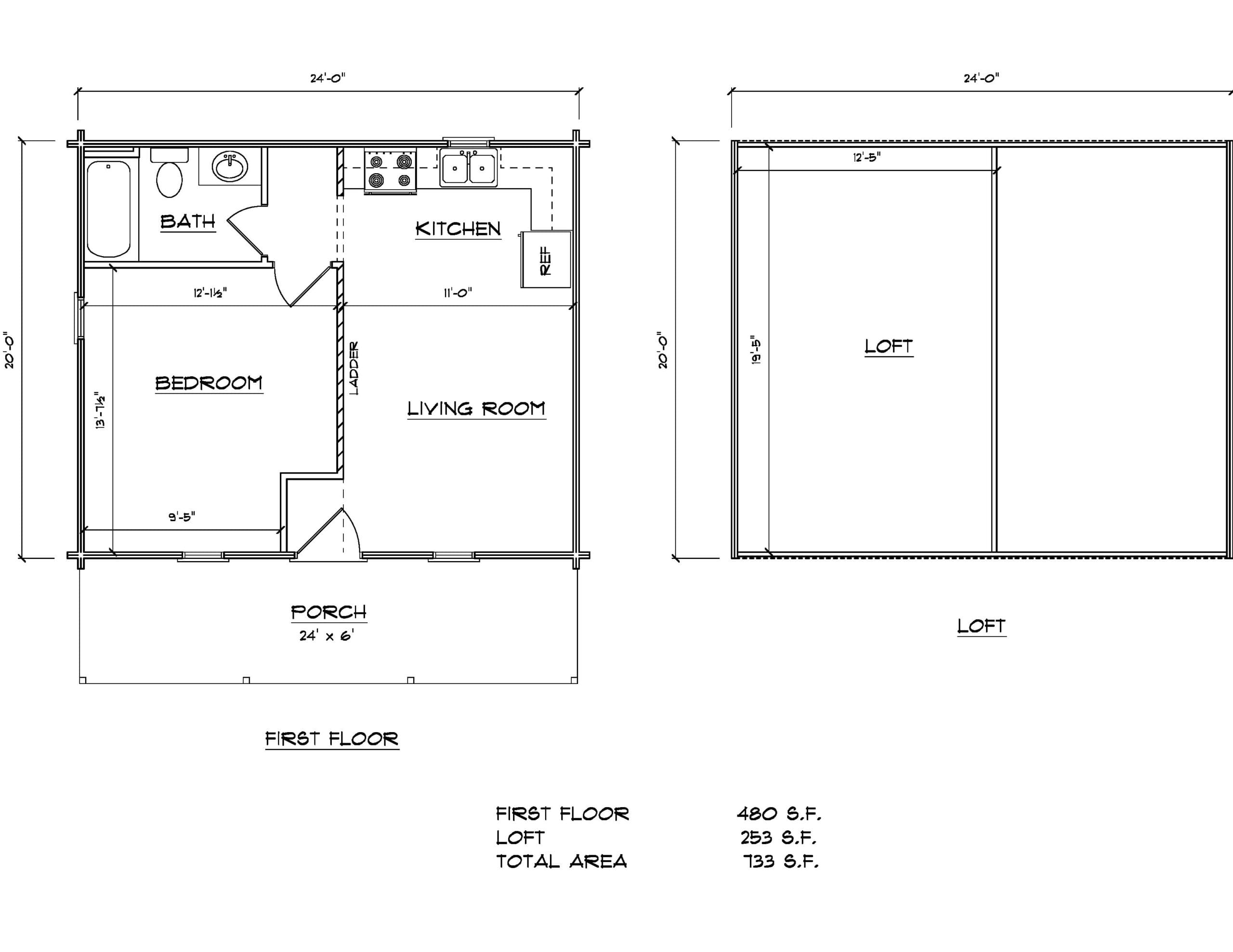 The Huntsman C introduces a loft while keeping the main floor highly functional. The first-floor blueprint shows a full living area with kitchen, bedroom, and bathroom, while the loft adds flexible sleeping or storage space above. This design works well for small families, guests, or owners who want separate sleeping zones without expanding the cabin’s footprint. The loft can be used as an additional bedroom, kids’ sleeping area, or overflow space for guests. As an EZ Build cabin, the Huntsman C is ideal for a vacation cabin, rental property, or longer stays where a bit more space is needed but simplicity is still a priority.